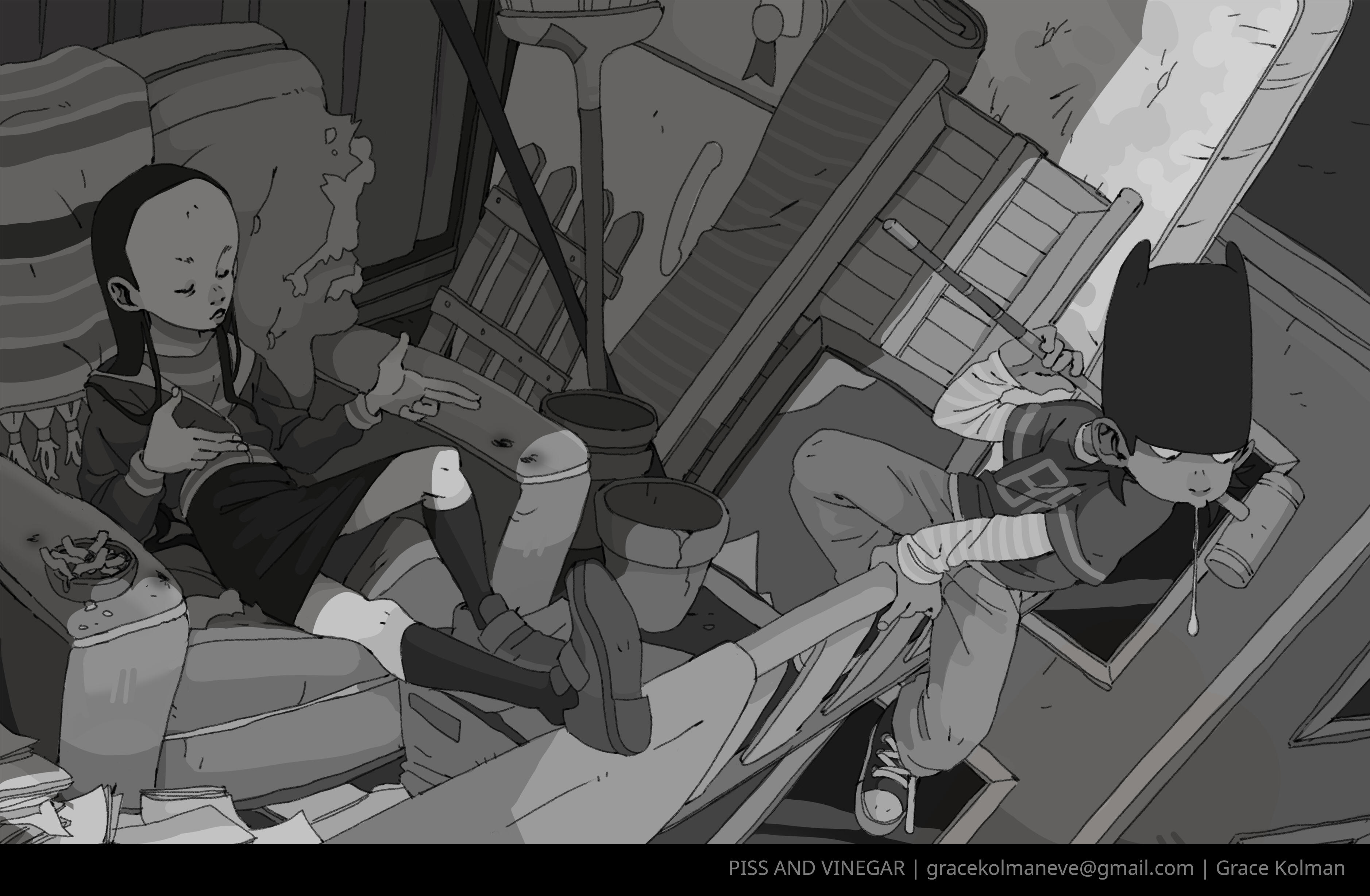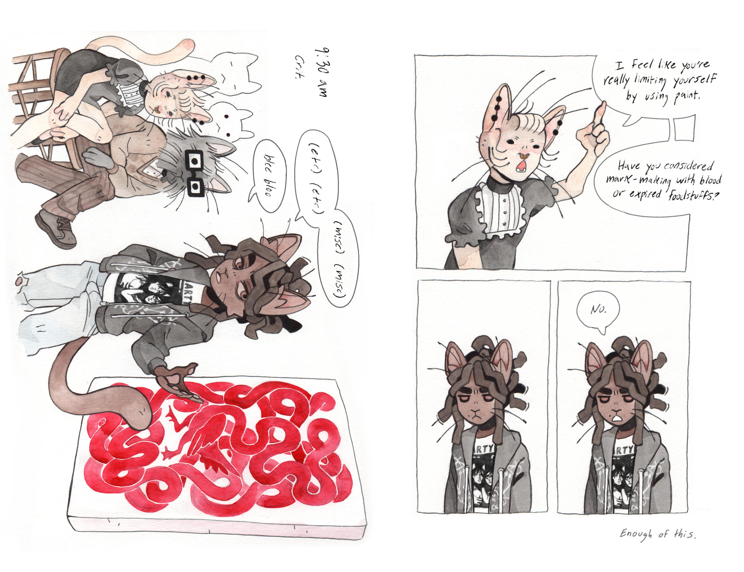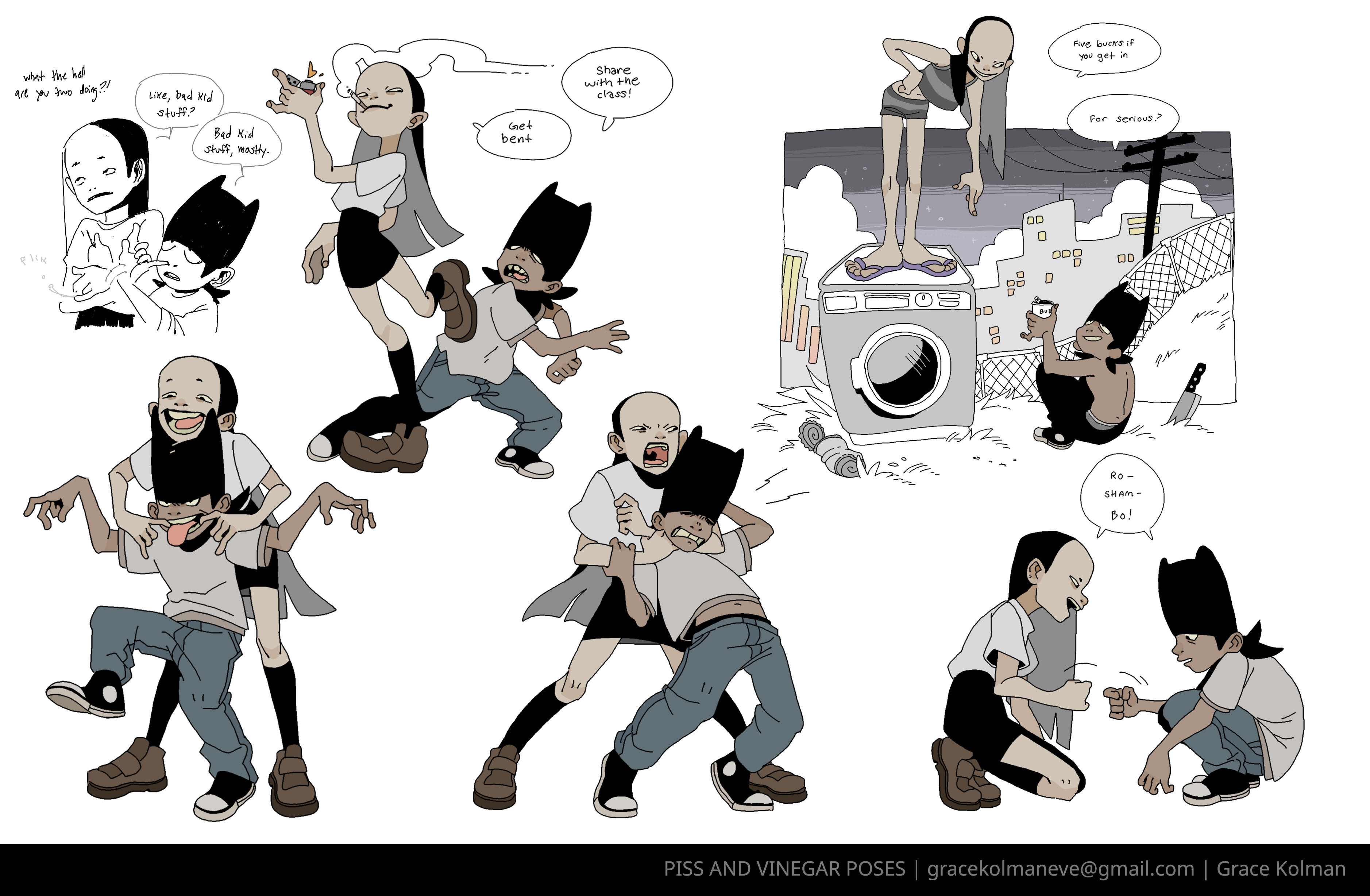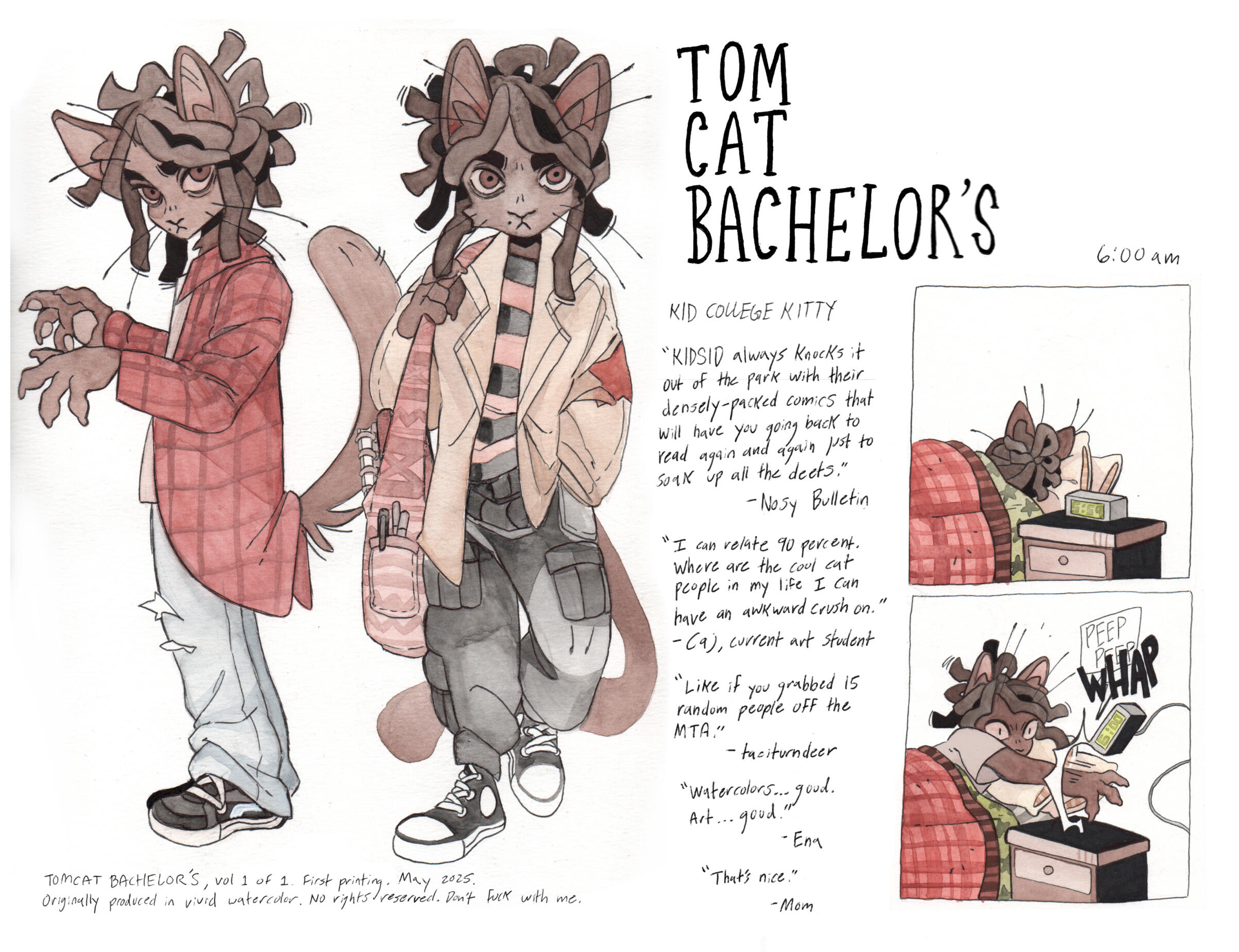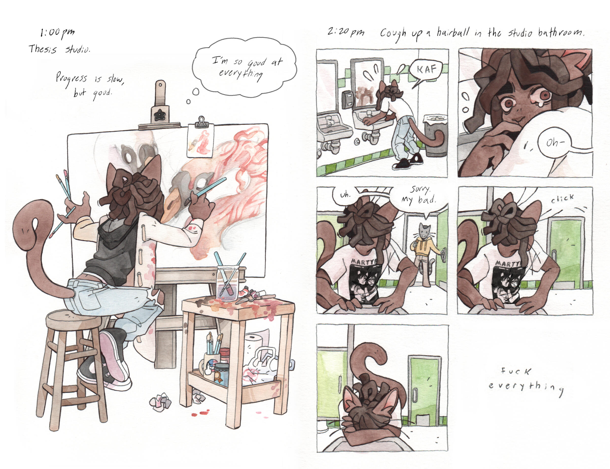 Grace Kolman draws, mostly comics. They have previously worked as a character and graphic designer, currently work as a freelance illustrator, and are hyping themself up in the mirror to make another comic. Grace’s last comic, Tomcat Bachelor's, was about a cat getting his art degree and all their friends “really liked” it.For any freelance or work opportunities, you can reach them at [email protected]