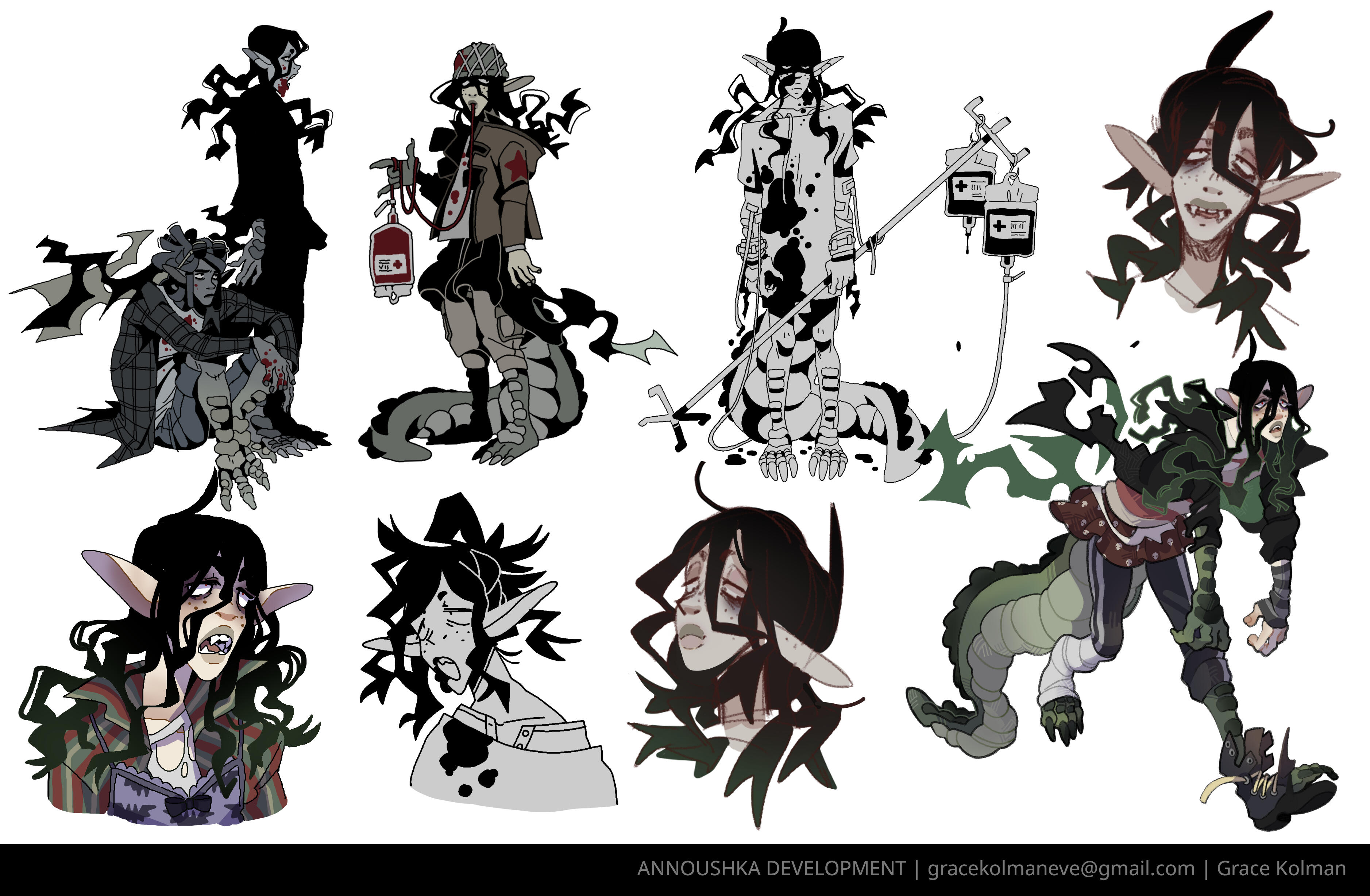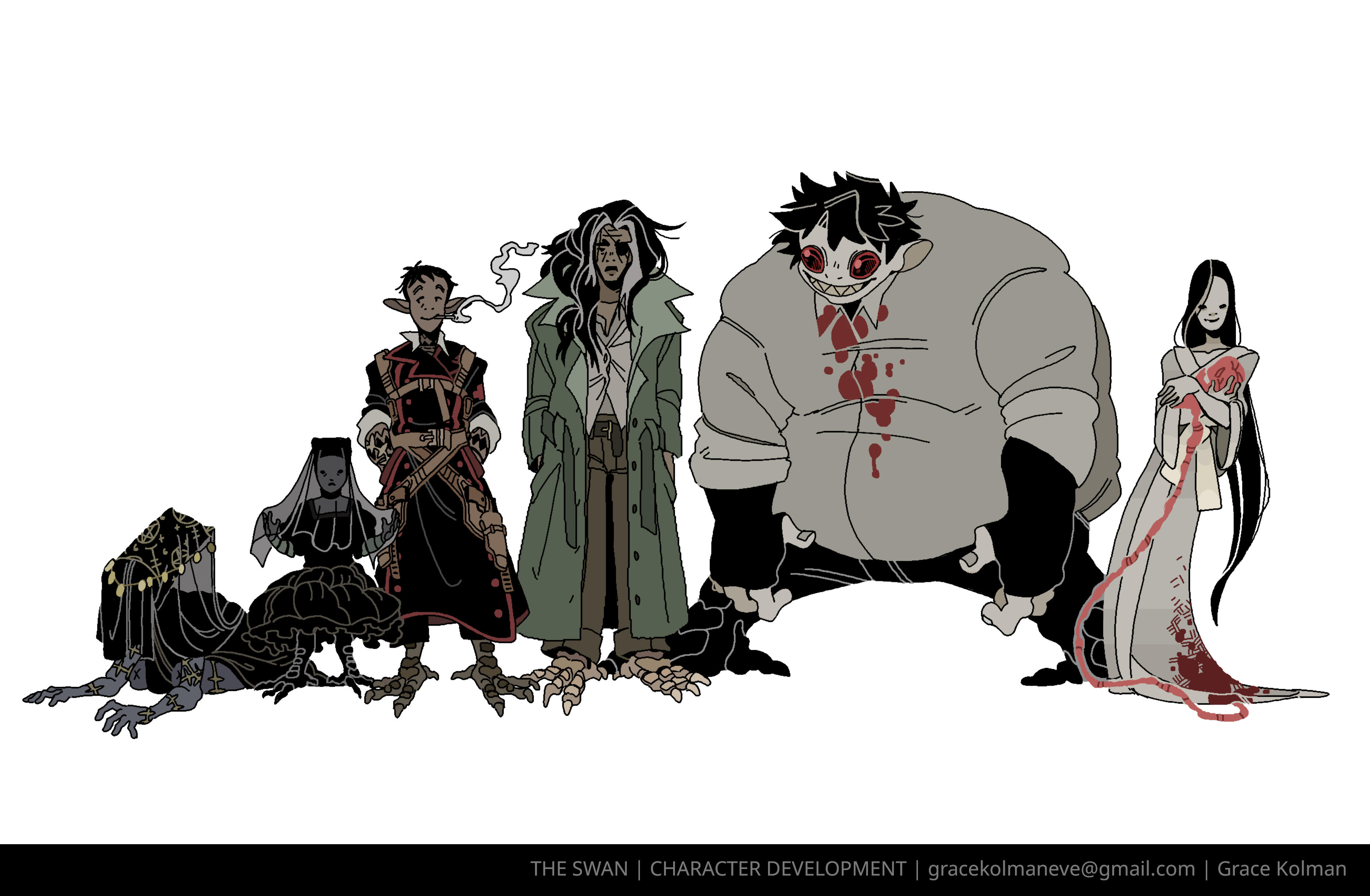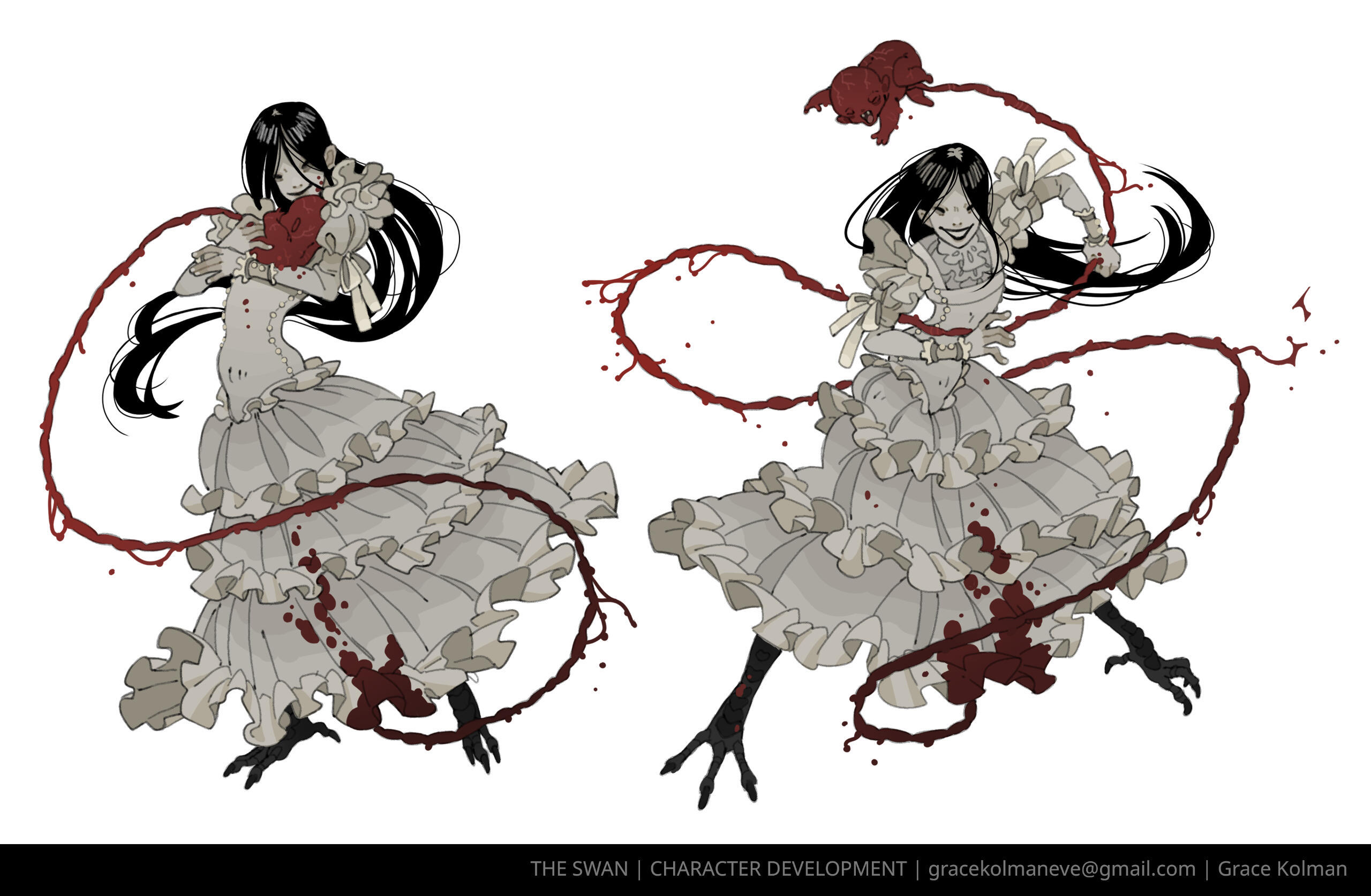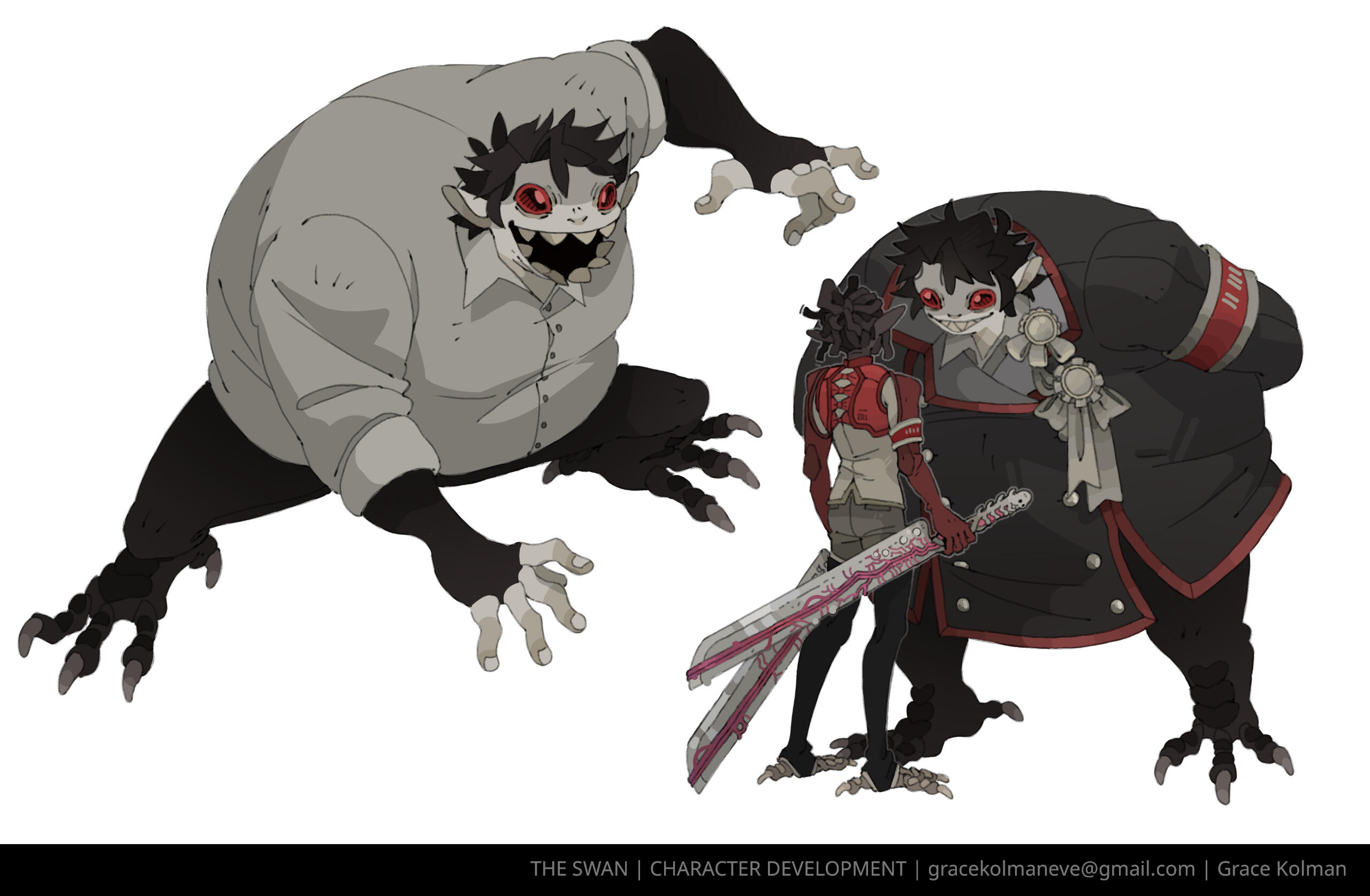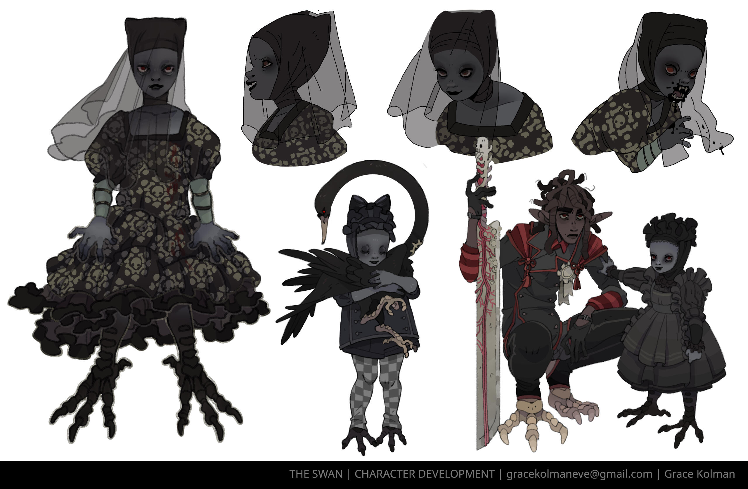 CARRION AND MORREAU - Dicephalpous DameTwice the heads means twice the fun! At least that's what Carrion and Morreau Figured when they cut and stitched themselves together. Which one is which anyway? Does it matter? No. It doesn't. You can hear them coming and going at Saint Charity's Hospital for Freaks and Weirdies by the clicking of plastic heels on clean linoleum tile. Clicky clicky, this was comes something icky. Carrion and Morreau don't need anyone other than each other, but should they ever desire autonomous companions, they can make one for themselves using their medical expertise in whatever troubling experiments they get up to in the dimly lit rooms at the ends of dark hallways where they like to spend their time. They can be seen dragging along their most protuberant pet, Gumdog. Their long fingers and steady hands make them a gifted surgeon and their extruded limbs and swift movements make them completely freaky. Carrion and Morreau! What a wonderful pair of ghouls!