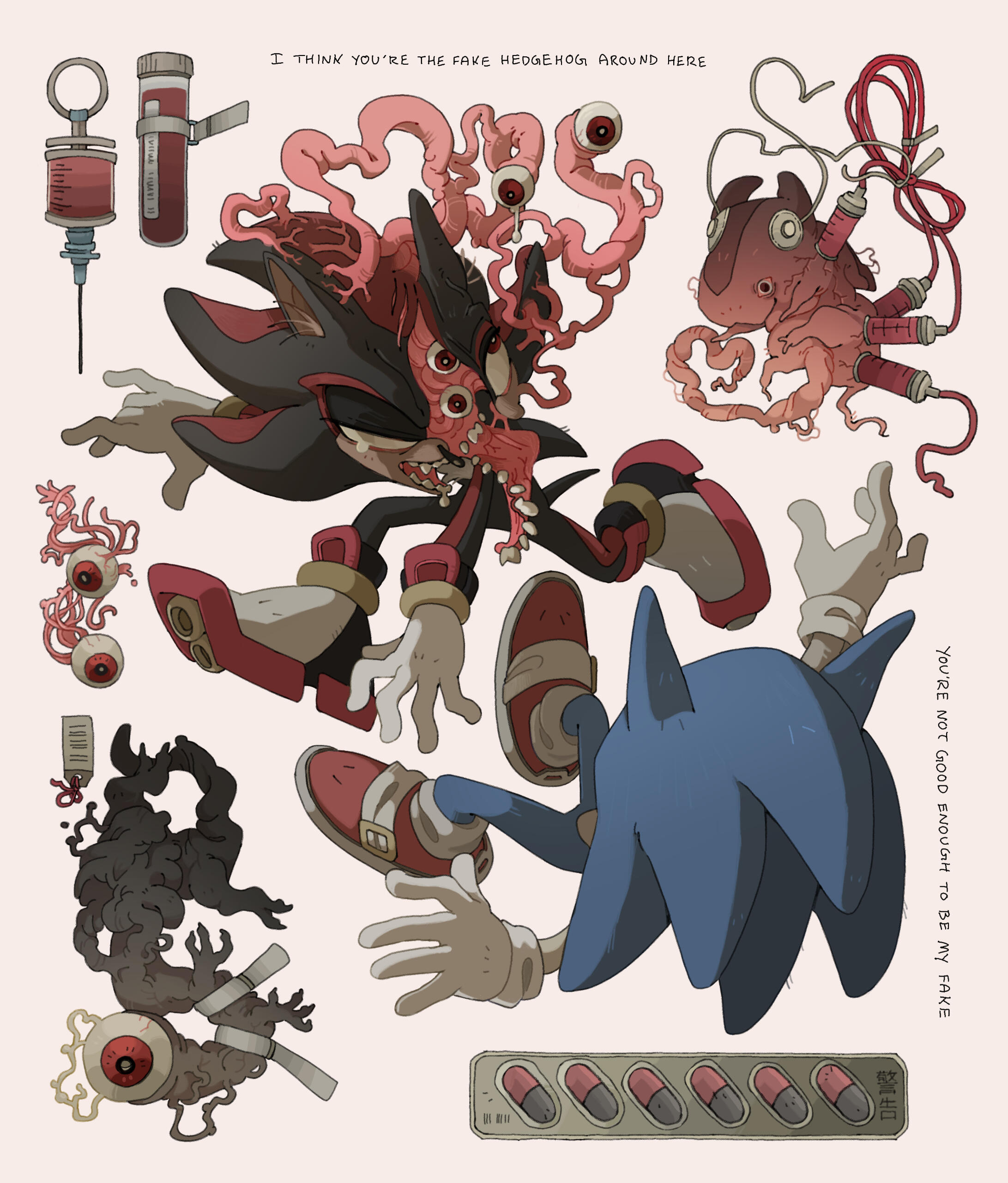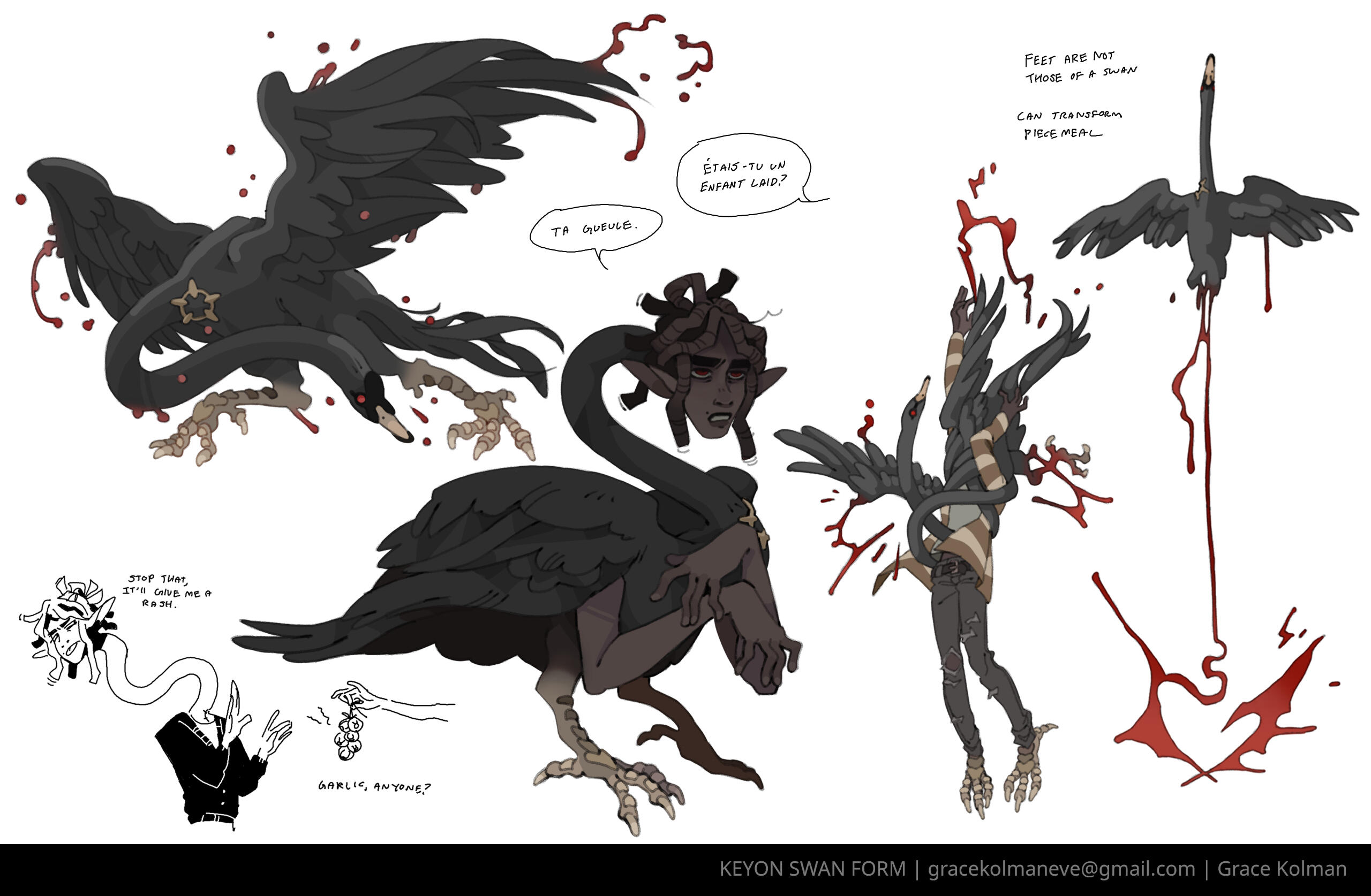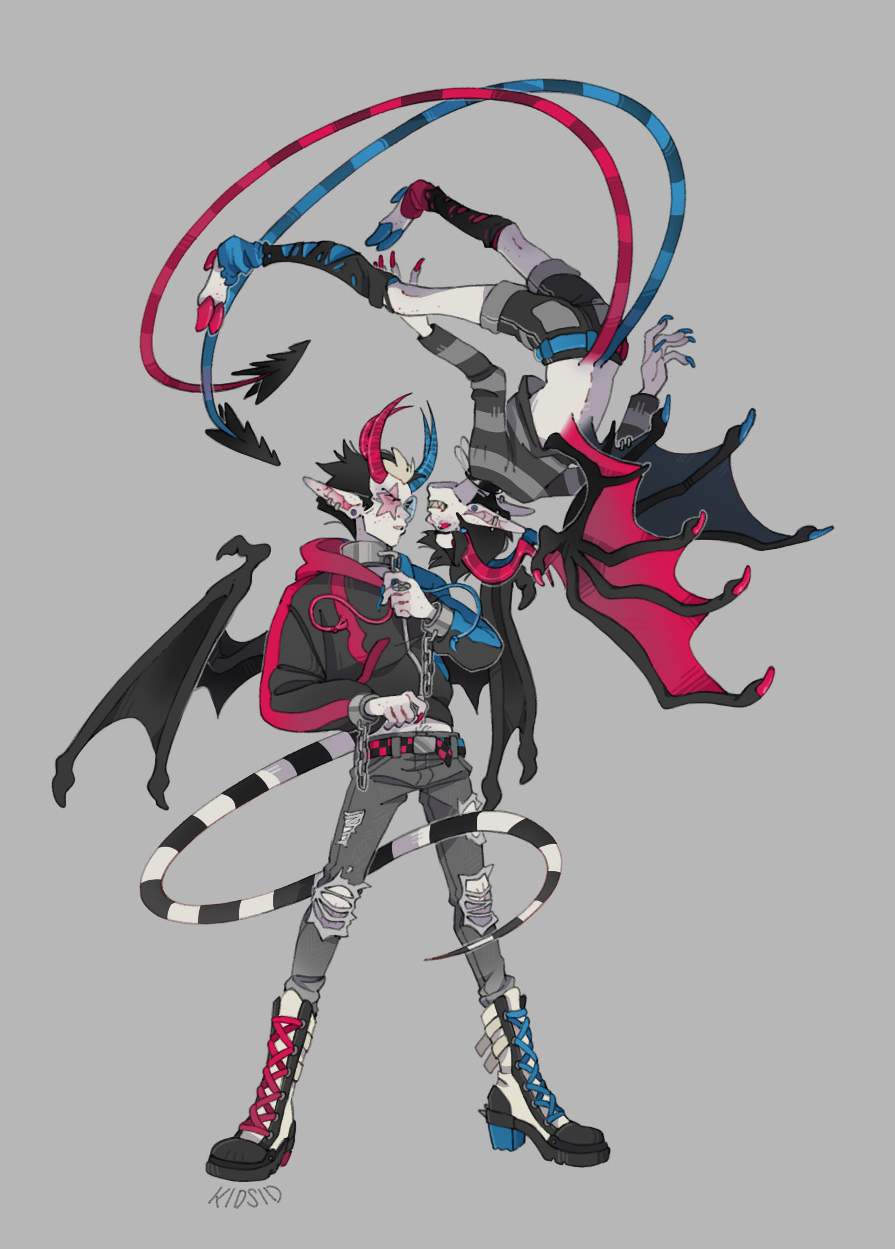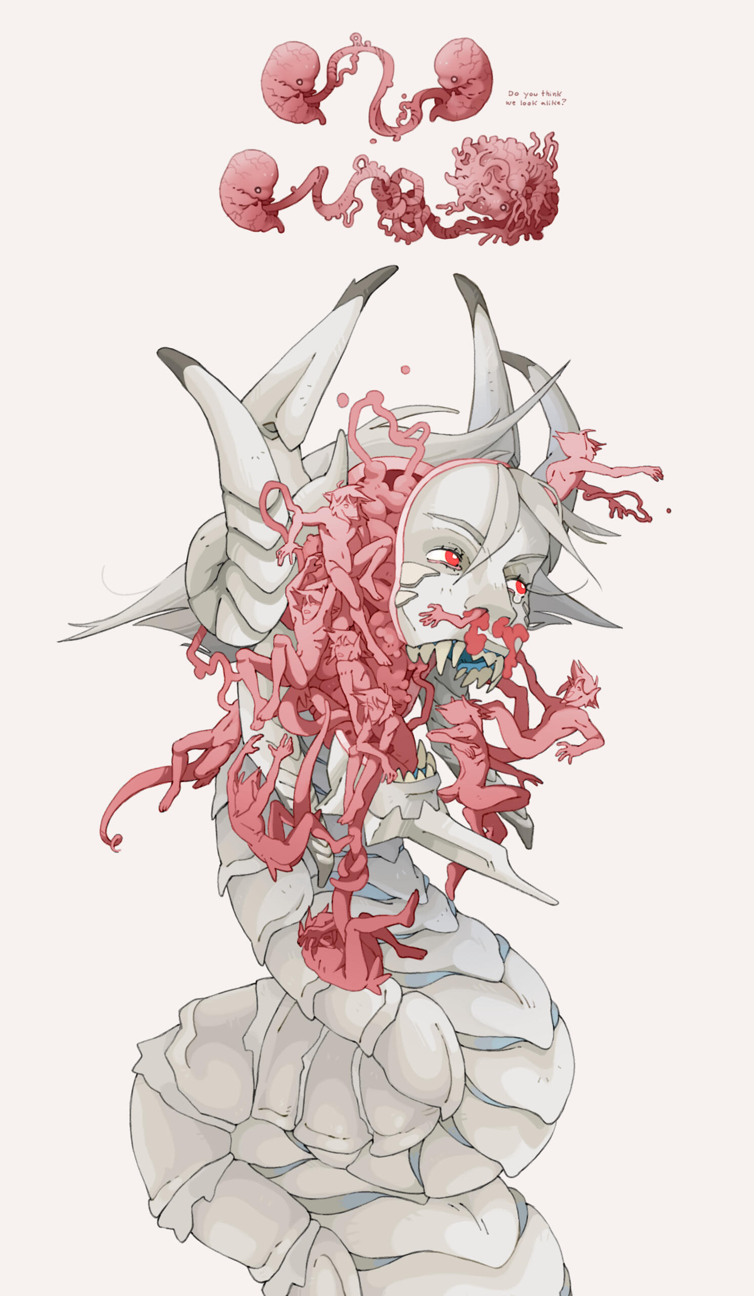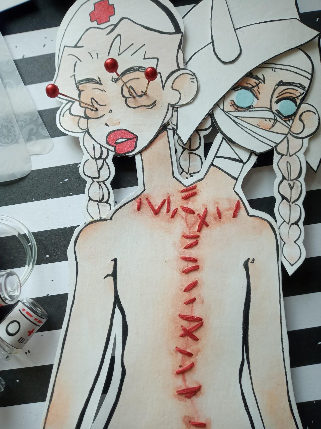 CARRION AND MORREAU - Dicephalpous DameTwice the heads means twice the fun! At least that's what Carrion and Morreau Figured when they cut and stitched themselves together. Which one is which anyway? Does it matter? No. It doesn't. You can hear them coming and going at Saint Charity's Hospital for Freaks and Weirdies by the clicking of plastic heels on clean linoleum tile. Clicky clicky, this was comes something icky. Carrion and Morreau don't need anyone other than each other, but should they ever desire autonomous companions, they can make one for themselves using their medical expertise in whatever troubling experiments they get up to in the dimly lit rooms at the ends of dark hallways where they like to spend their time. They can be seen dragging along their most protuberant pet, Gumdog. Their long fingers and steady hands make them a gifted surgeon and their extruded limbs and swift movements make them completely freaky. Carrion and Morreau! What a wonderful pair of ghouls!