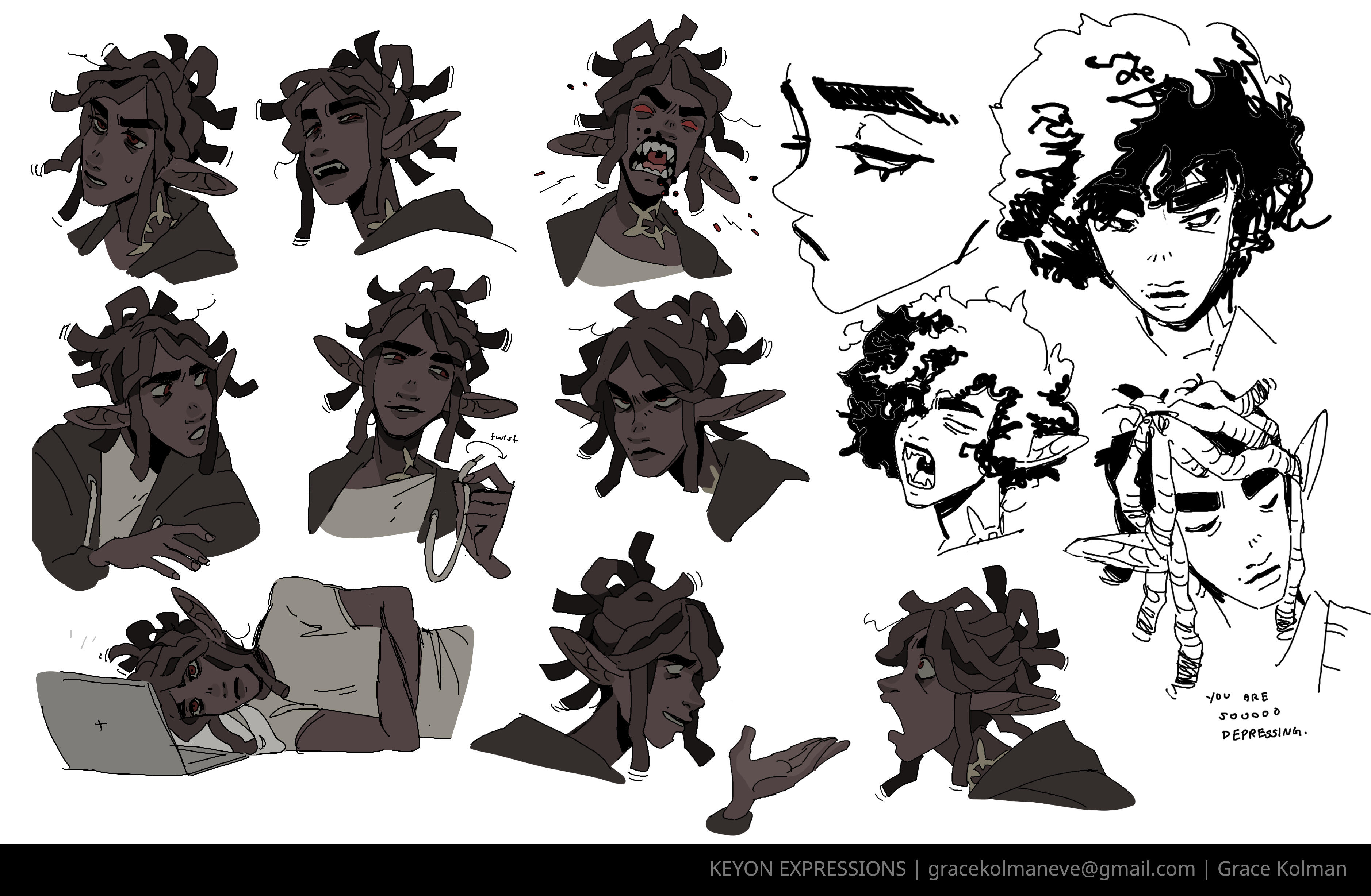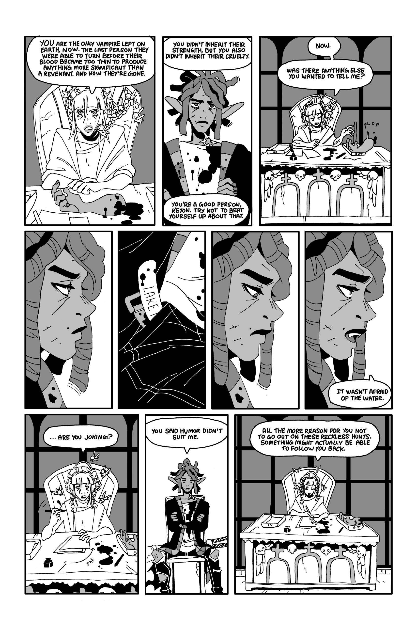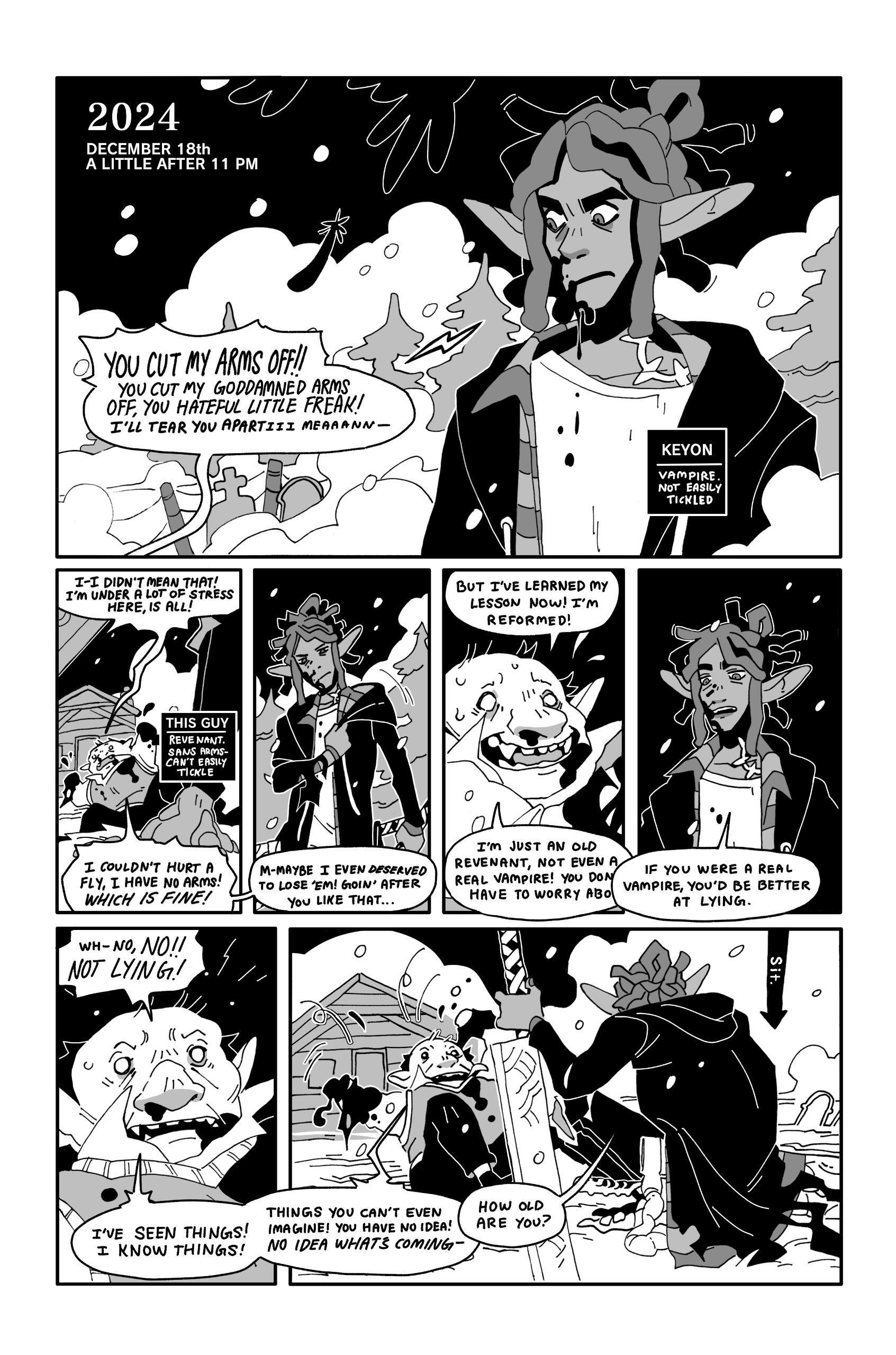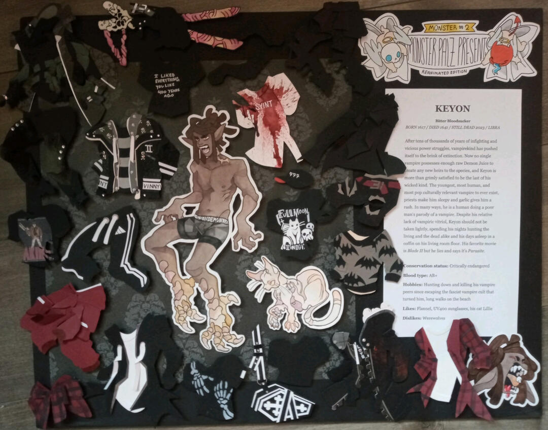 KEYON - Bitter BloodsuckerAfter tens of thousands of years of infighting and vicious power struggles, vampirekind has pushed itself to the brink of extinction. Now no single vampire possesses enough raw Demon Juice to create any new heirs to the species, and Keyon is more than grimly satisfied to be the last of his wicked kind. The youngest, most human, and most pop culturally relevant vampire to ever exist, priests make him sleepy and garlic gives him a rash. In many ways, he is a human doing a poor man's parody of a vampire. Despite his relative lack of vampiric vitriol, Keyon should not be taken lightly, spending his nights hunting the living and the dead alike and his days asleep in a coffin on his living room floor.