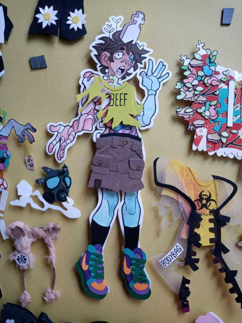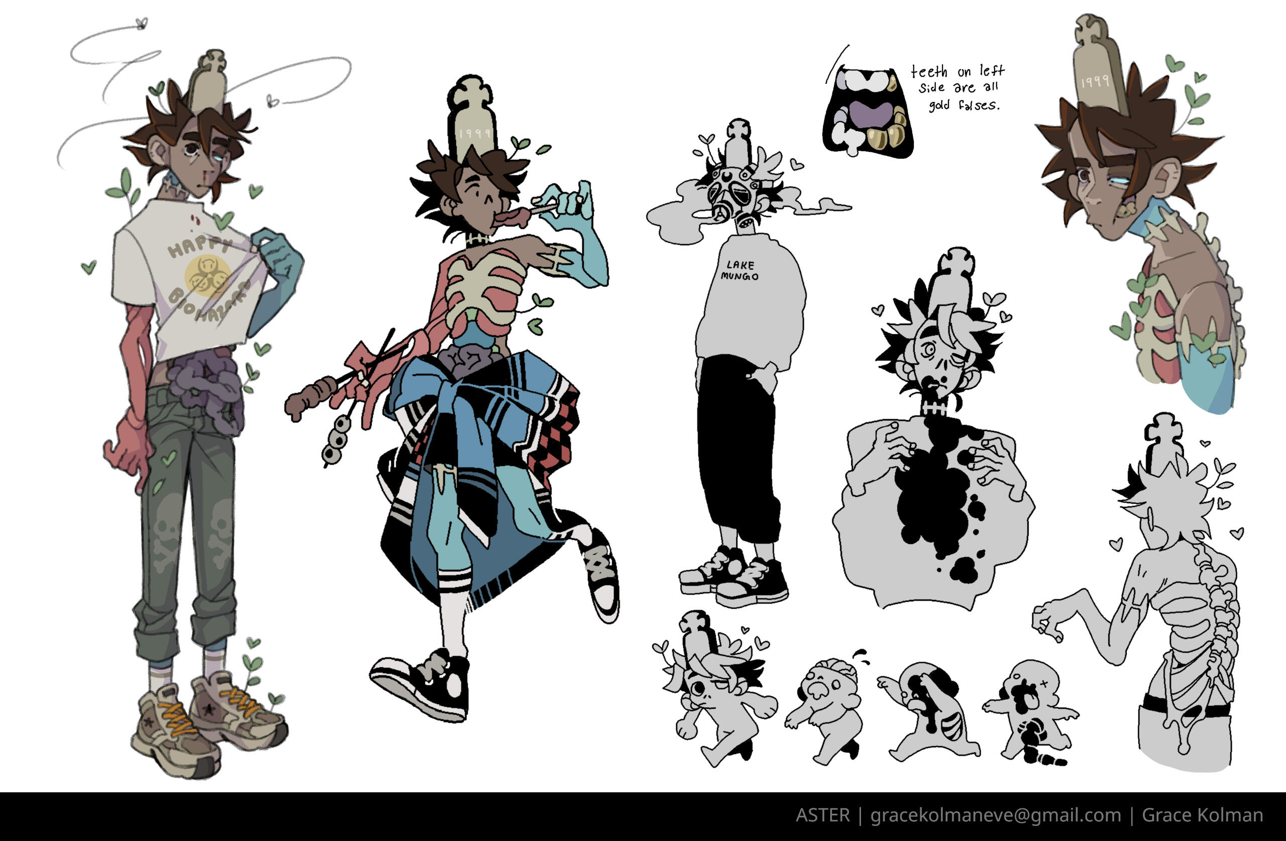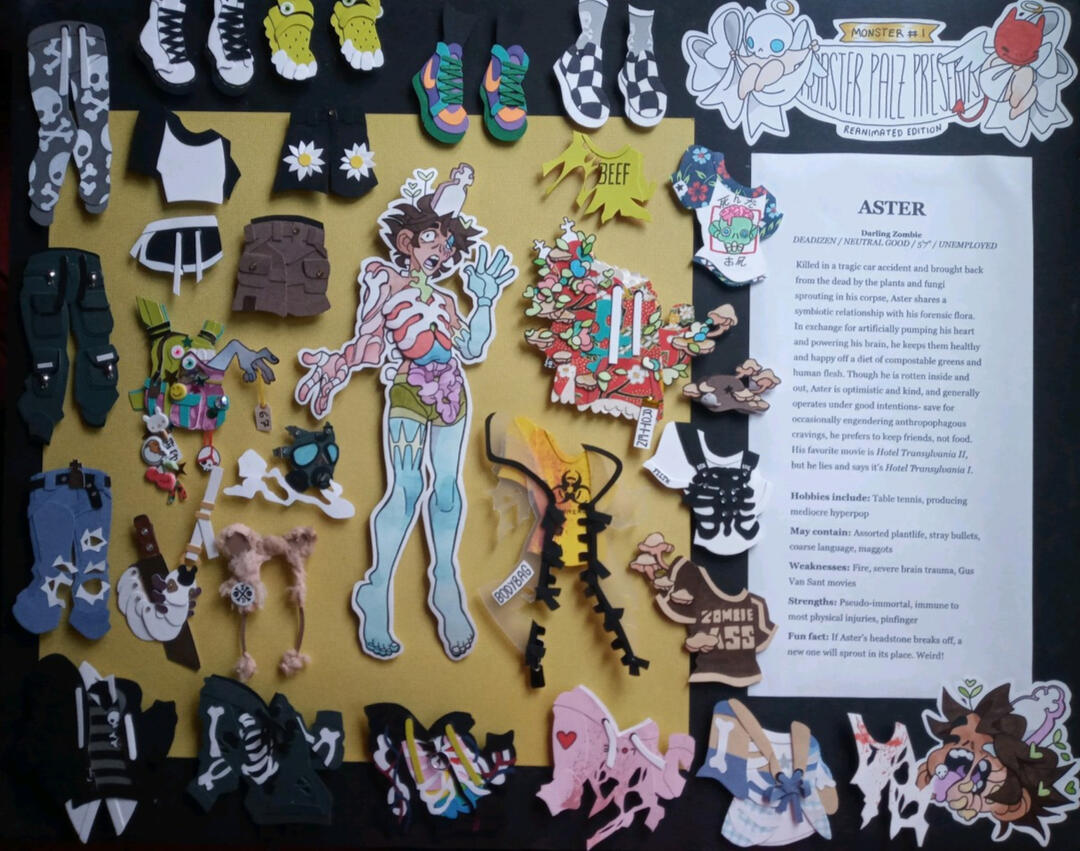 ASTER - Darling ZombieKilled in a tragic car accident and brought back from the dead by the plants and fungi sprouting in his corpse, Aster shares a symbiotic relationship with his forensic flora. In exchange for artificially pumping his heart and powering his brain, he keeps them healthy and happy off a diet of compostable greens and human flesh. Though he is rotten inside and out, Aster is optimistic and kind, and generally operates under good intentions- save for occasionally engendering anthropophagous cravings, he prefers to keep friends, not food. His favorite movie is Hotel Transylvania II, but he lies and says it’s Hotel Transylvania I.