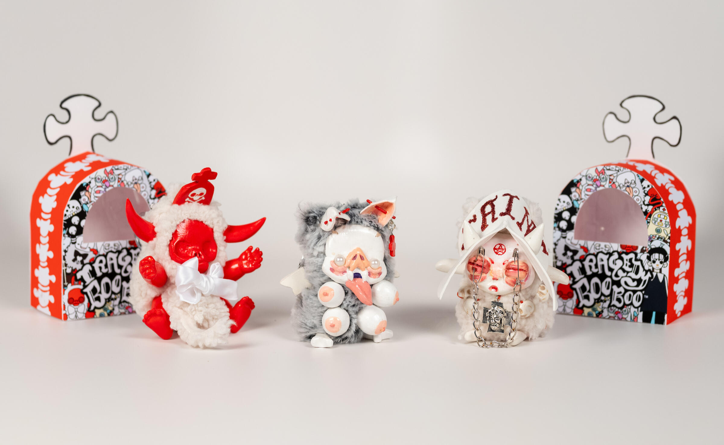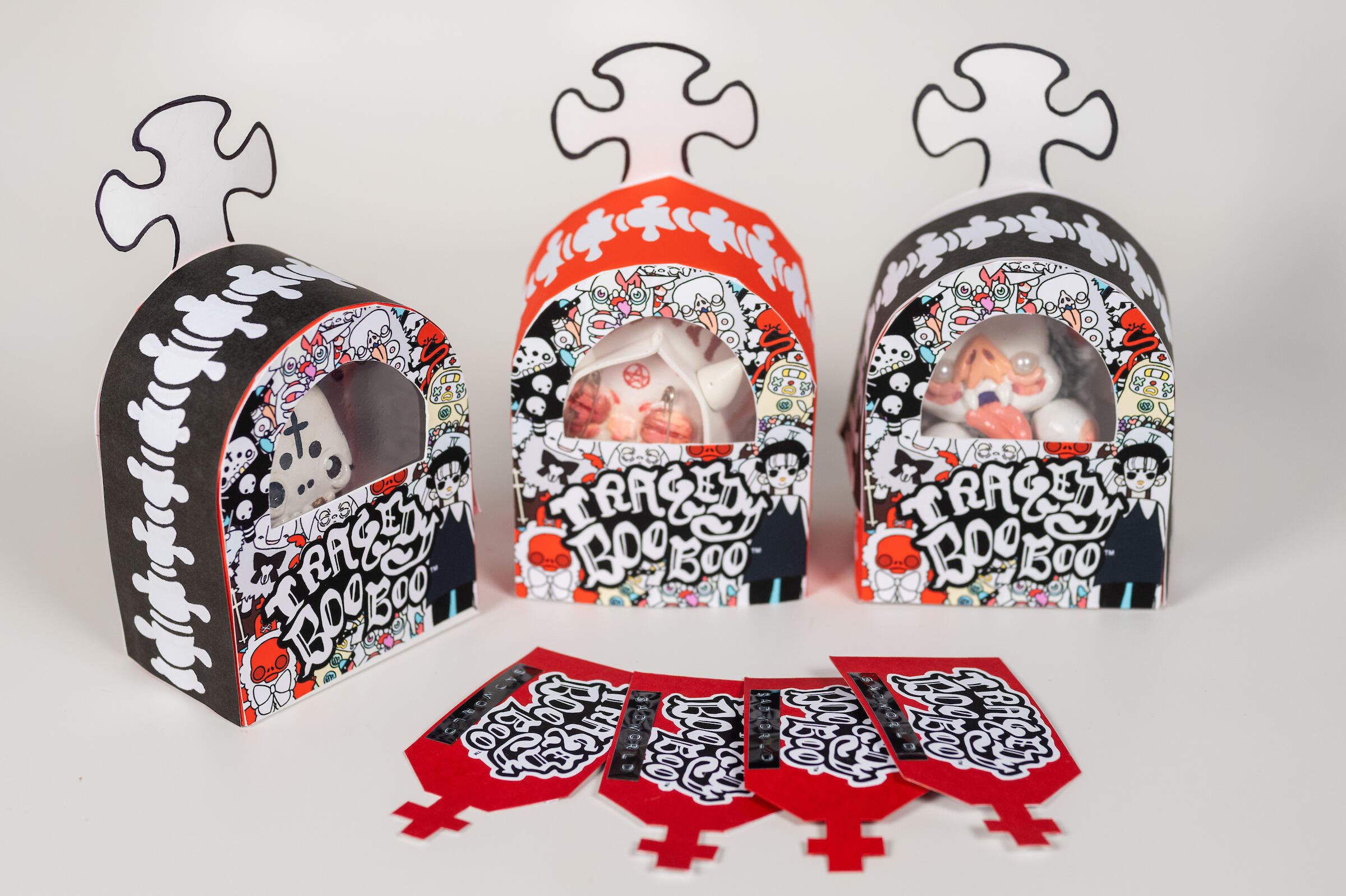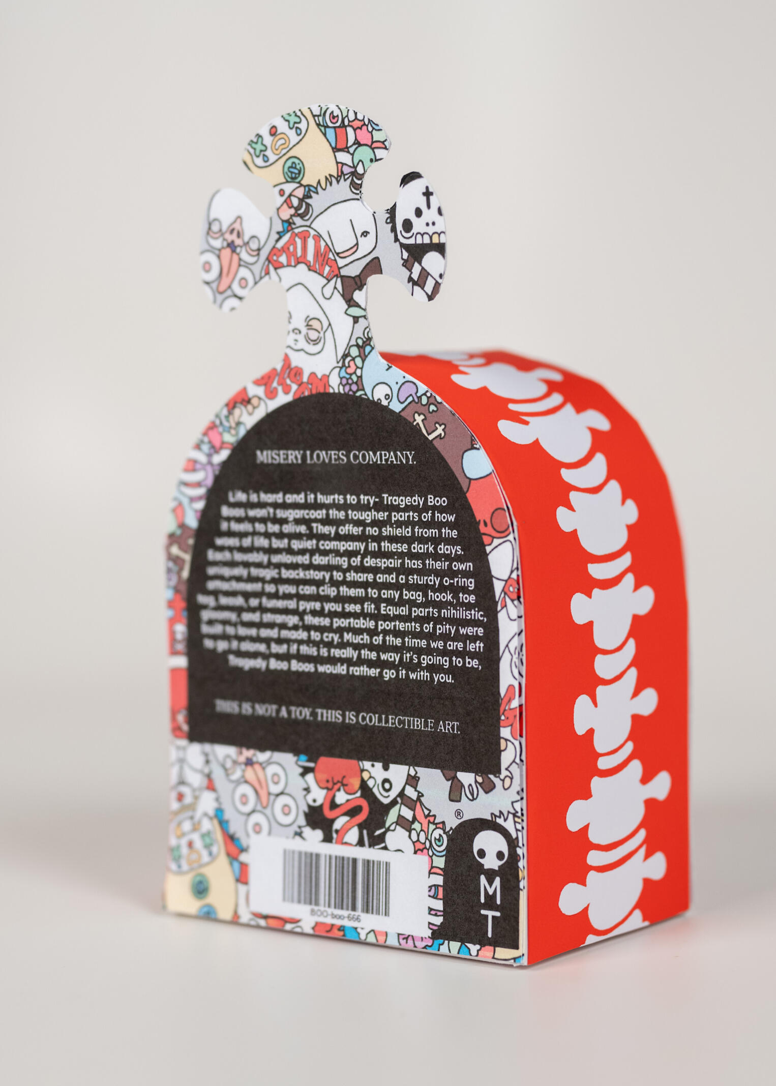 MISERY LOVES COMPANY.Life is hard and it hurts to try- Tragedy Boo Boos won’t sugarcoat the tougher parts of how it feels to be alive. They offer no shield from the woes of life but quiet company in these dark days. Each lovably unloved darling of despair has their own uniquely tragic backstory to share and a sturdy o-ring attachment so you can clip them to any bag, hook, toe tag, leash, or funeral pyre you see fit. Equal parts nihilistic, gloomy, and strange, these portable portents of pity were built to love and made to cry. Much of the time we are left to go it alone, but Tragedy Boo Boos would rather go it with you.