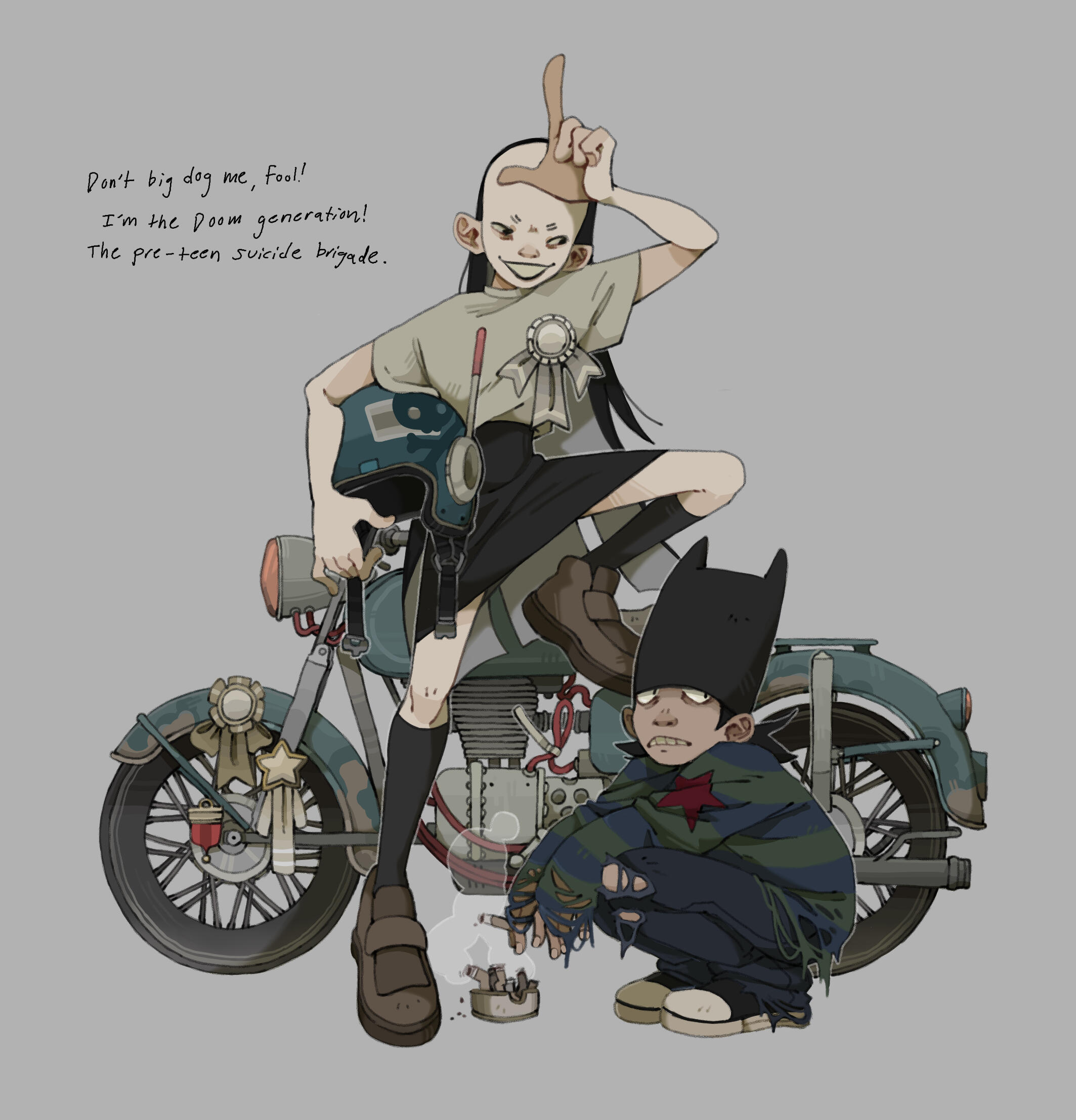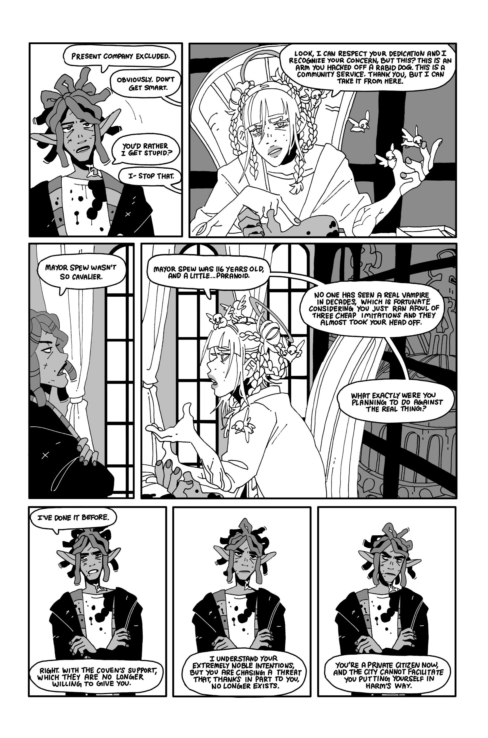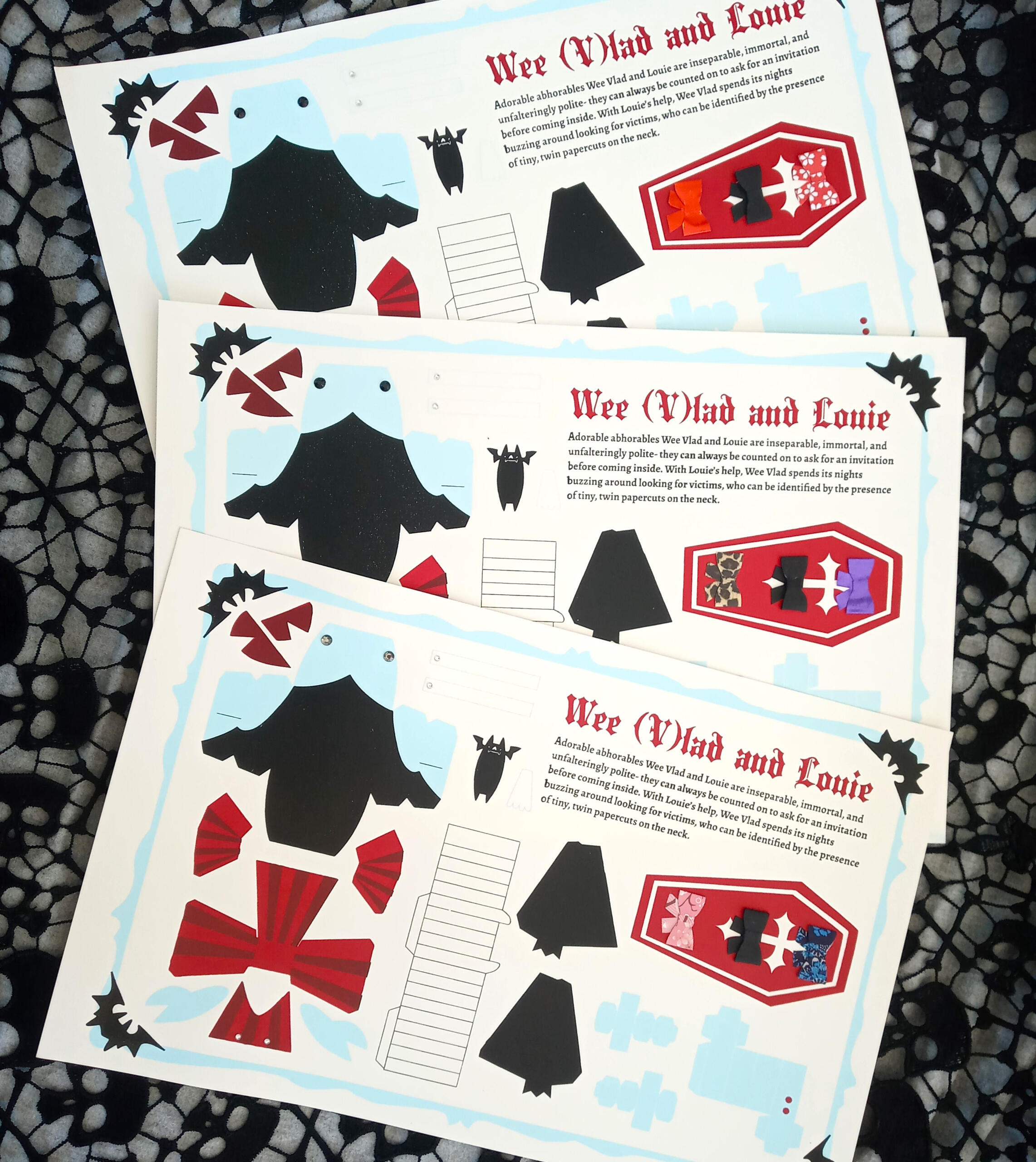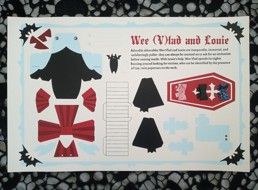 Adorable abhorables Wee Vlad and Louie are inseperable, immortal, and unfalteringly polite- they can always be counted on to ask for an invitation before coming inside. With Louie's help, Wee Vlad spends its nights buzzing around looking for victims, who can be identified by the presence of tiny, twin paper cuts on the neck.