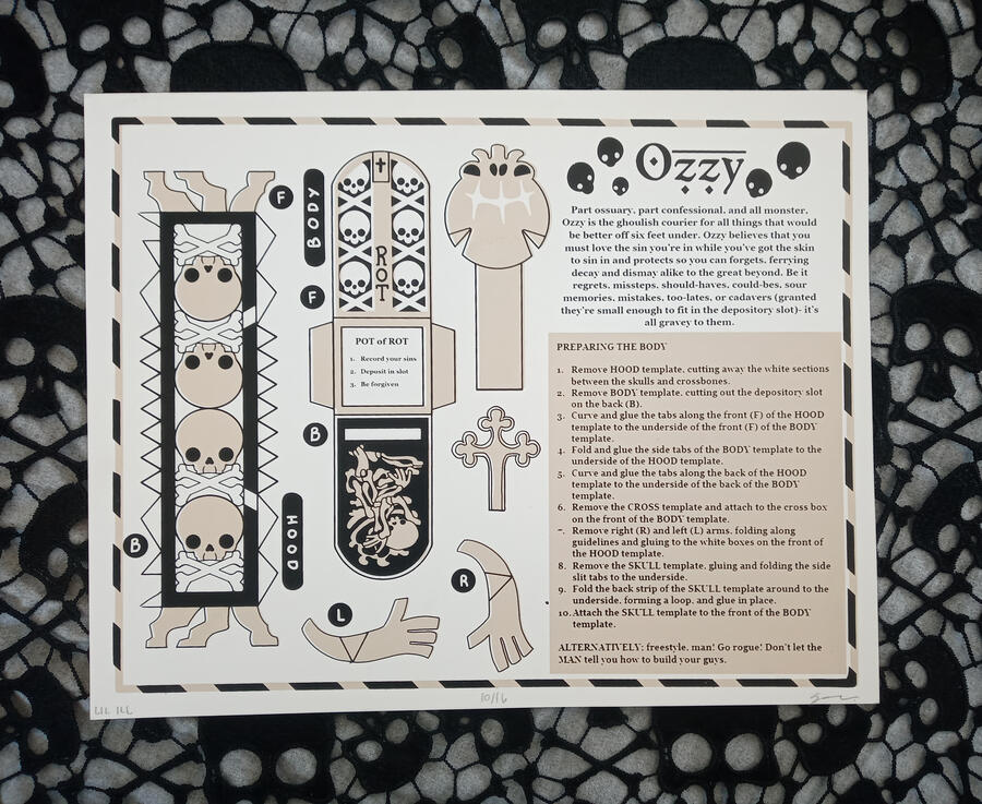 Part ossuary, part confessional, and all monster, Ozzy is the ghoulish courier for all things that would be better off six feet under. Ozzy believes that you must love the sin you’re in while you’ve got the skin to sin in and protects so you can forgets, ferrying decay and dismay alike to the great beyond. Be it regrets, missteps, should-haves, could-bes, sour memories, mistakes, too-lates, or cadavers (granted they’re small enough to fit in the depository slot)- it’s all gravey to them.